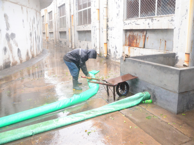 8月10日,臺風(fēng)帶來的強(qiáng)降水洶洶而至。公司黨委書記、董事長王力民到公司各處巡查督導(dǎo),防汛應(yīng)急小組成員各就各位,各部門按職能分工,全力以赴投入到鏖戰(zhàn)“利奇馬”這場硬仗當(dāng)中。為了防止雨水進(jìn)入生產(chǎn)車間,各車間在提前安裝好防水擋板、壘砌防汛沙袋基礎(chǔ)上,每個出入口都安排專人看護(hù),對出現(xiàn)漏水、漏電等情況及時采取措施。在生產(chǎn)現(xiàn)場,相關(guān)設(shè)備人員及時檢查電源柜、防汛泵等設(shè)備,保障正常運行;提前增加的安全照明裝置,有效增強(qiáng)了臺風(fēng)期間的現(xiàn)場亮度。針對室外積水積水較深這一情況,開啟防汛泵,將積水排入雨水管道,對積水超過100㎜后安插警示標(biāo)識,并且擺放防汛凳,保障員工安全出入;對外圍排水口及下水管道及時沖洗、清理,以避免廠區(qū)積水影響到生產(chǎn)運行。