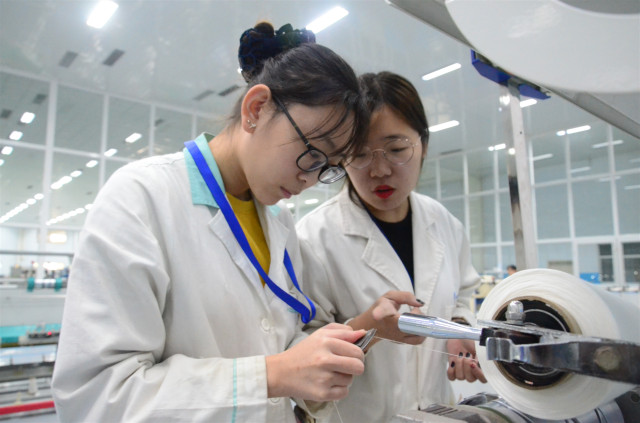 圖為公司工程技術(shù)研究院兩名科研人員,正在進(jìn)行新纖維開發(fā)試驗(yàn)。