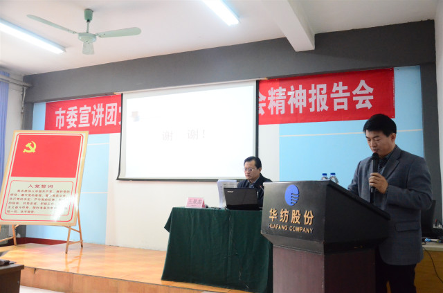 通過宣講學習,公司黨員代表和管理者代表紛紛表示,一定要凝心聚力,開拓創(chuàng)新,把思想行動統(tǒng)一到黨的十九屆四中全會精神上來,持續(xù)深入學習全會精神,切實抓好全會部署的各項決策任務的落實。公司黨委副書記、總經(jīng)理閆英山談到:“通過宣講學習,讓我們進一步了解了全會精神,為我們?nèi)A紡這樣的國有企業(yè)指明了前進方向。我們要堅定不移地貫徹、落實好全會精神,大力推進轉(zhuǎn)型升級、提質(zhì)增效,努力實現(xiàn)新時代華紡的高質(zhì)量發(fā)展,不懈推動‘一體兩翼’發(fā)展布局,持續(xù)做強華紡品牌,為經(jīng)濟社會高質(zhì)量發(fā)展作出更大貢獻。”宣講報告會由公司副總經(jīng)理孫玉濤主持。