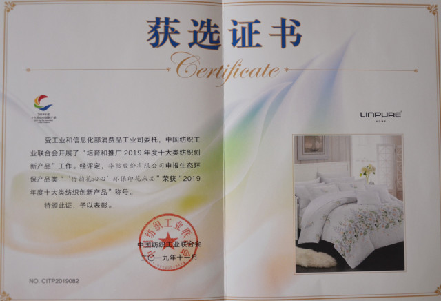 公司床品獲“2019年度十大類紡織創(chuàng)新床品”稱號