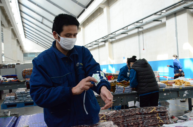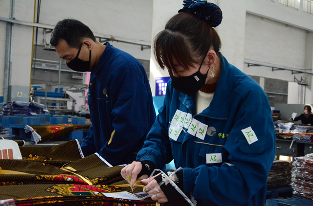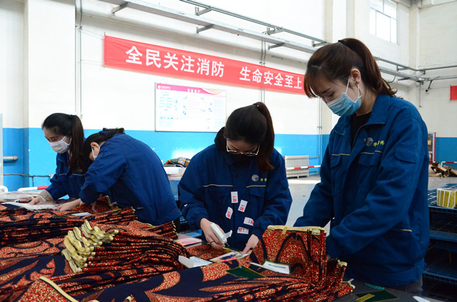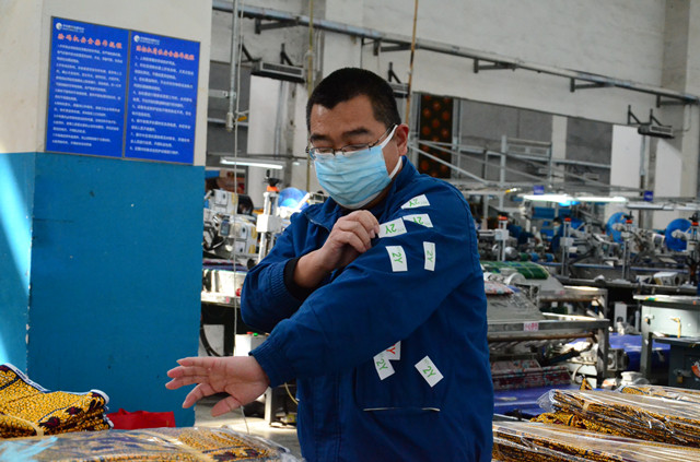 在公司印染整裝車間,員工們?yōu)榱耸构ぷ餍矢?,將商?biāo)的標(biāo)簽事先集中臨時(shí)粘在工裝的胸前、衣袖等處,干起活來不僅順手,而且提高了產(chǎn)品包裝速度。他(她)們很陽光地調(diào)侃說,這是特殊的服“飾”呢!