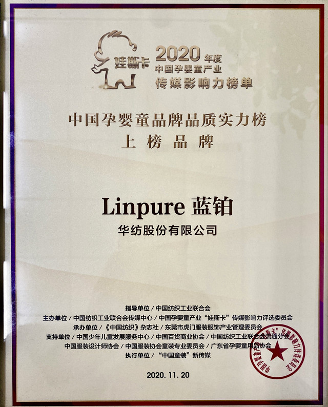 日前,公司Linpure藍鉑品牌既獲“娃斯卡”2019年度中國孕嬰童品牌暖心實力榜后,再獲中國孕嬰童產(chǎn)業(yè)“娃斯卡”傳媒影響力評選委員會頒發(fā)的2020年度中國孕嬰童品牌品質(zhì)實力大獎。