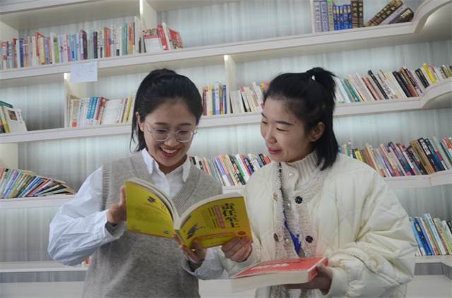 圖為公司女職工薛湛然(左)和蘆成雨(右),在職工書(shū)屋討論讀書(shū)心得的情形。