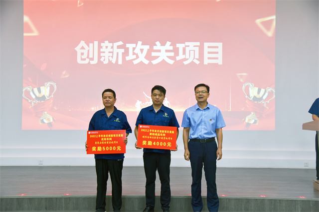 會上,李風明宣讀了公司對2022年上半年度CQI項目、創(chuàng)新攻關成果等表彰決定;盛守祥為CQI項目代表、創(chuàng)新攻關一等獎項目代表頒發(fā)獎勵牌,總經理閆英山為各車間創(chuàng)新攻關其他受獎項目代表頒發(fā)獎勵牌,李風明為質量之星、效率之星、工藝操作之星受獎代表頒發(fā)榮譽證書,公司安全總監(jiān)孫中然為現場6S之星、精益提案之星受獎代表頒發(fā)榮譽證書。會議由公司團委書記陳冰主持。