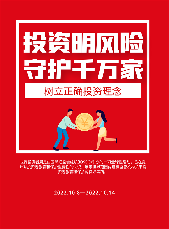 2022年“世界投資者周”將圍繞“投資明風(fēng)險,守護(hù)千萬家”主題,向投資者普及《期貨和衍生品法》、普及綠色金融、綠色投資理念,引導(dǎo)投資者閱讀上市公司定期報告、踐行以信息披露為核心的注冊制理念,向投資者傳播金融證券知識,提示投資風(fēng)險,增強(qiáng)理性投資、價值投資、長期投資、風(fēng)險防范意識,引導(dǎo)投資者樹立正確投資理念。