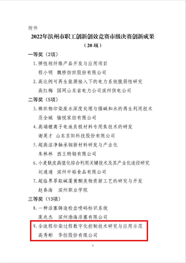 近日,濱州市總工會下發(fā)了《關(guān)于公布2022年濱州市職工創(chuàng)新創(chuàng)效競賽市級決賽創(chuàng)新成果名單的通知》。公司由信息互聯(lián)部軟件開發(fā)組主管高秀彬組織開發(fā)的“全流程印染過程數(shù)字化控制技術(shù)研究與應(yīng)用示范”項(xiàng)目榮獲三等獎。
