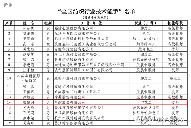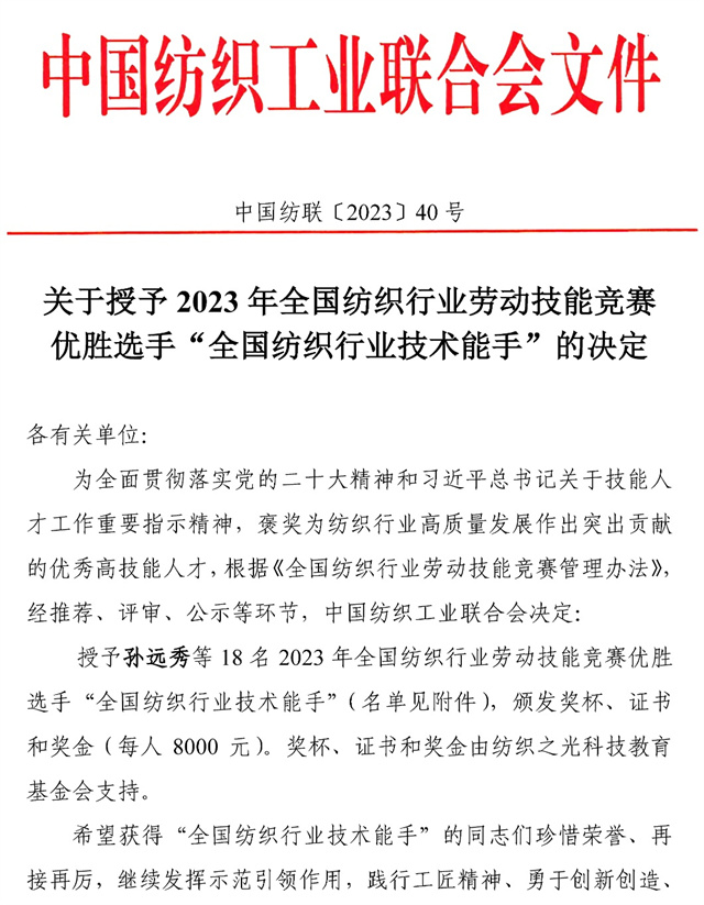 導(dǎo)讀:近日,中國紡織工業(yè)聯(lián)合會(huì)發(fā)布了授予在2023年全國紡織行業(yè)勞動(dòng)技能競賽中取得前18名的紡織企業(yè)員工為“全國紡織行業(yè)技術(shù)能手”榮譽(yù)稱號(hào)的決定,