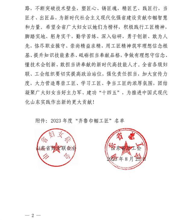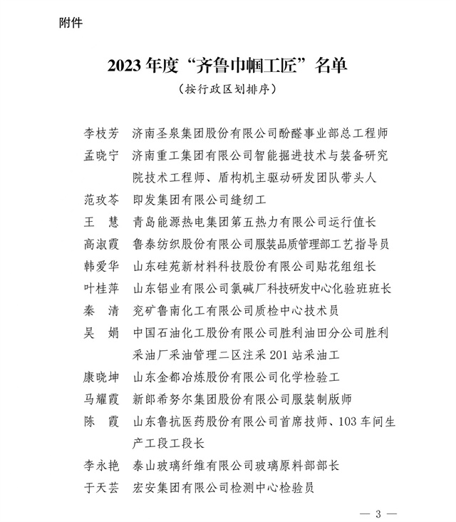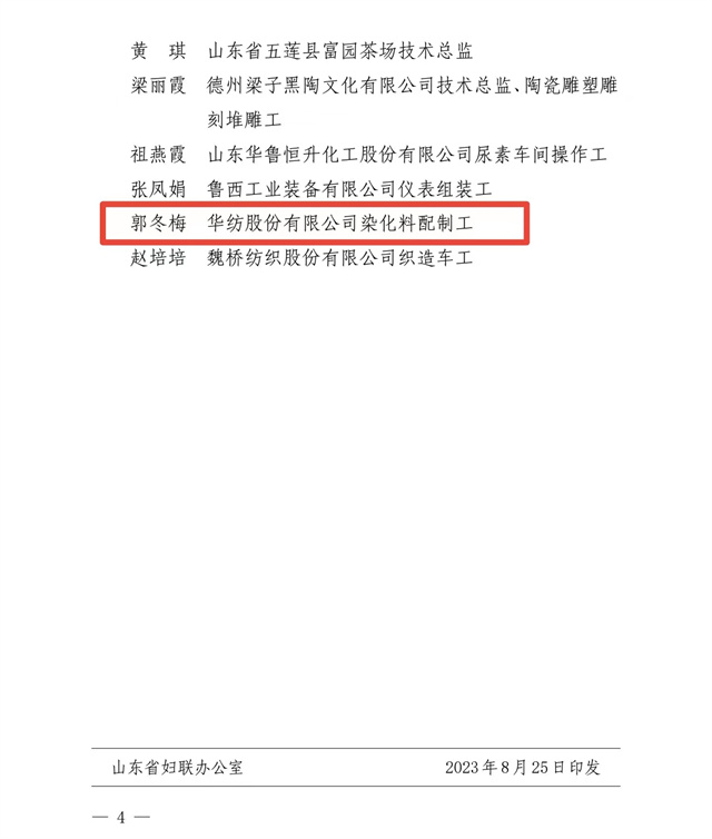 導(dǎo)讀:近日,山東省婦女聯(lián)合會(huì)、山東省總工會(huì)發(fā)布了“關(guān)于公布2023年度‘齊魯巾幗工匠’的通知”,公司染化料配制工郭冬梅名列其中。