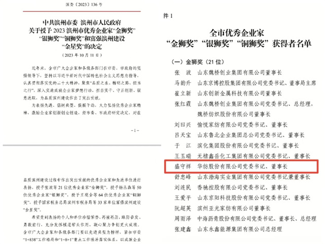 會(huì)上,對(duì)在品質(zhì)濱州建設(shè)過(guò)程中作出突出貢獻(xiàn)的優(yōu)秀企業(yè)家和先進(jìn)單位進(jìn)行了表彰頒獎(jiǎng),公司黨委書(shū)記、董事長(zhǎng)盛守祥先生榮獲2023濱州市優(yōu)秀企業(yè)家“金獅獎(jiǎng)”。