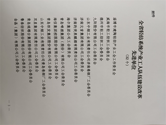 近日,省輕工紡織工會(huì)三屆四次全委會(huì)暨全省輕紡系統(tǒng)產(chǎn)業(yè)工人隊(duì)伍建設(shè)改革推進(jìn)會(huì)議在濟(jì)南召開(kāi)。會(huì)上公布了全省輕紡系統(tǒng)產(chǎn)業(yè)工人隊(duì)伍建設(shè)改革先進(jìn)單位名單,公司工會(huì)委員會(huì)名列其中。