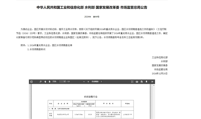 導(dǎo)讀:日前,國家工信部、水利部、發(fā)展改革委、市場監(jiān)管總局等四部門聯(lián)合公示了“2024年重點用水企業(yè)、園區(qū)水效領(lǐng)跑者名單”,公司成功入選國家級重點企業(yè)水效領(lǐng)跑者