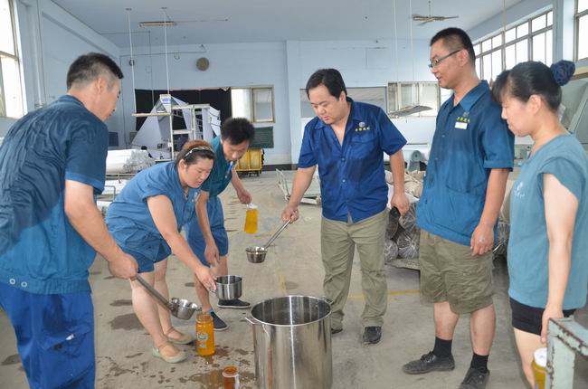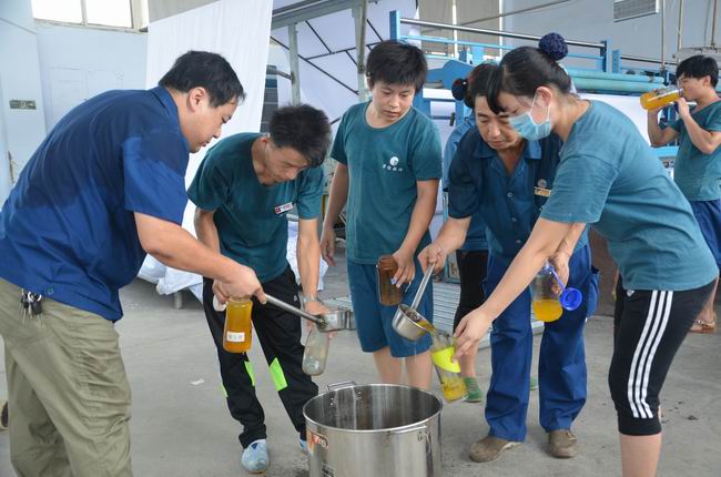 7月29日,當(dāng)日濱州市溫度高達(dá)35℃,華紡股份有限公司管理者將冰好的橘子粉化制飲品到一線(xiàn)生產(chǎn)崗位,一一分發(fā)到正在當(dāng)班的員工水杯中,緩解高溫為員工帶來(lái)的酷熱,送上一份清涼和關(guān)愛(ài)。