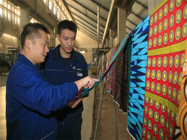 11月23日,在公司花二車間的生產(chǎn)現(xiàn)場,工程師田道國(左)與印制乙班班長寧方乾(右)來到“疵布展示區(qū)”,就最近兩天印花產(chǎn)品的質(zhì)量情況進行交流與討論。