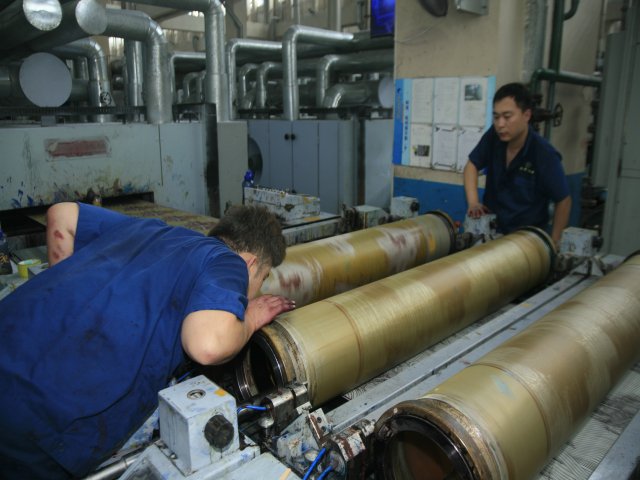 花一車間后處理技術(shù)員張延軍(圖右)與軋光機(jī)機(jī)長(zhǎng)吳秀祝在交流生產(chǎn)情況。他倆表示,每一米優(yōu)質(zhì)產(chǎn)品都是靠專注認(rèn)真干出來(lái)的。