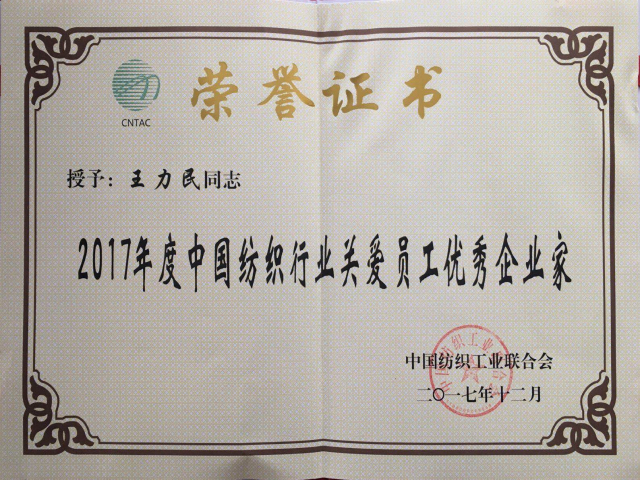 導(dǎo)讀:日前,中國(guó)紡織工業(yè)聯(lián)合會(huì)2017年人才工作大會(huì)在濟(jì)南召開(kāi),公司榮獲“2017年度中國(guó)紡織行業(yè)人才成長(zhǎng)最佳企業(yè)”稱(chēng)號(hào);王力民榮獲“2017年度中國(guó)紡織行業(yè)關(guān)愛(ài)員工優(yōu)秀企業(yè)家”稱(chēng)號(hào)。