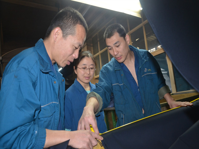 圖為面一車間甲班班長孟繁強(左)、組長孫新強(右)、出檢劉丙娟,在查看當(dāng)班下機產(chǎn)品的質(zhì)量情況。
